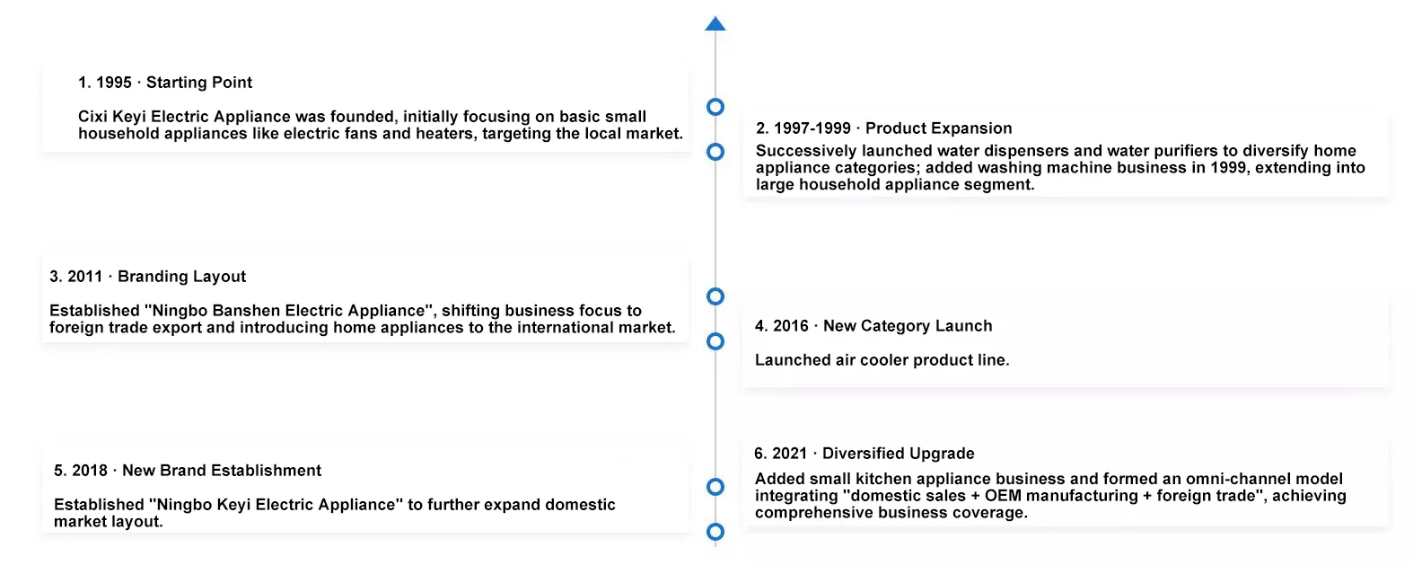 Sa ilang dekada ng tuluy-tuloy na pag-unlad, ang Ningbo Keyi Electric Appliance Co., Ltd. ay dumaan sa sumusunod na paglalakbay: Noong 1995, itinatag ang Cixi Keyi Electric Appliance, sa una ay tumutuon sa lokal na merkado at higit sa lahat ay nakikipag-ugnayan sa maliliit na gamit sa bahay gaya ng mga electric fan at heater.