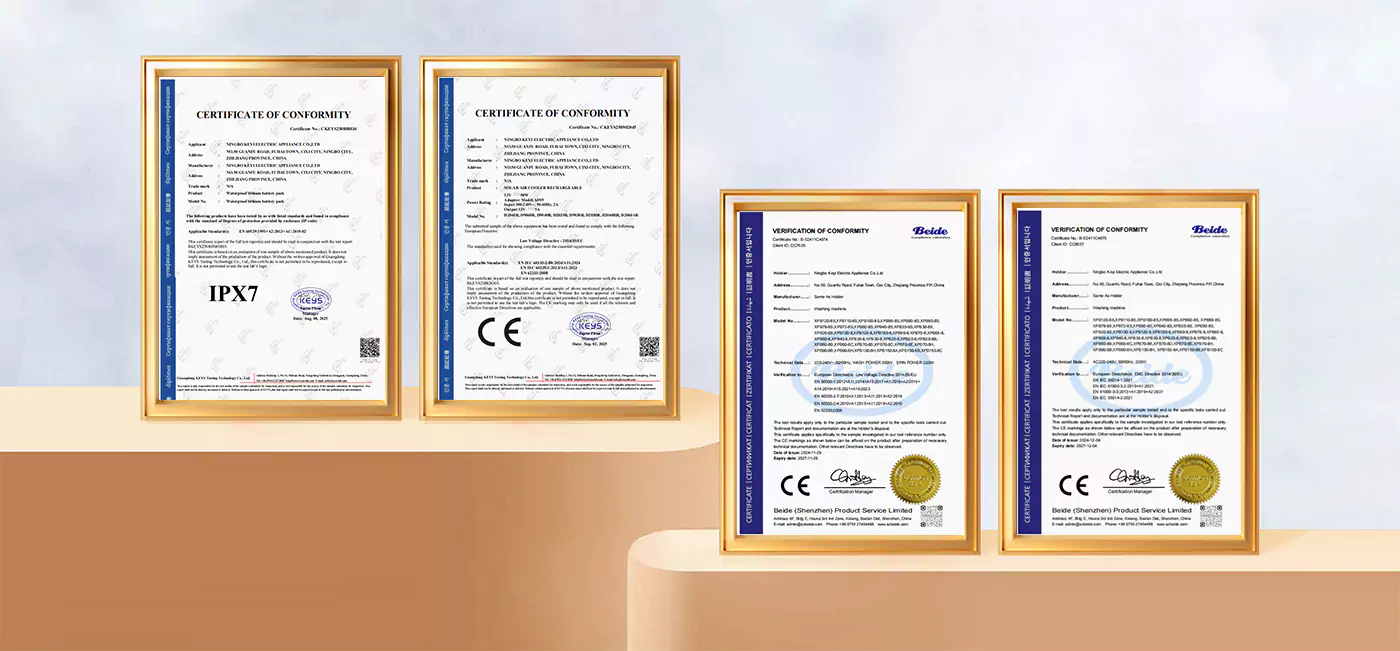 Ang aming mga washing machine at air cooler ay nakapasa sa EU testing standards at nakakuha ng CE certification. Ipinagmamalaki ng baterya ang rating na hindi tinatablan ng tubig ng IPX7. Certified din kami bilang isang natitirang nagbebenta sa mga domestic na platform ng e-commerce at Alibaba.